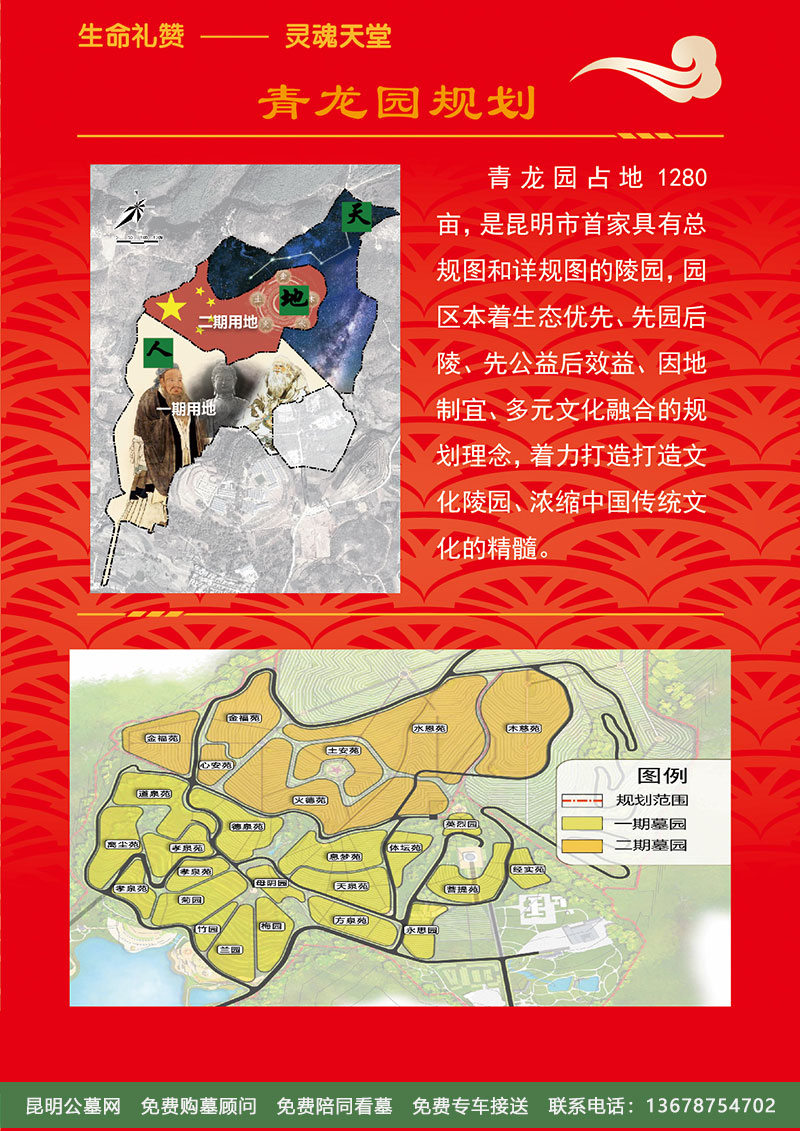 青龙园占地1280亩,是昆明市首家具有总规图和详规图的陵园,园区本着生态优先、先园后陵、先公益后效益、因地制宜、多元文化融合的规划理念,着力打造打造文化陵园、浓缩中国传统文化的精髓。