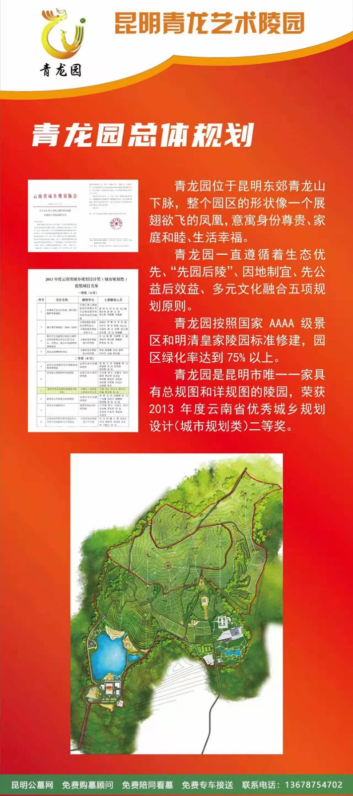 青龙园是昆明市一家具有总规图和详规图的陵园,荣获2013年度云南省优秀城乡规划设计(城市规划类)二等奖。