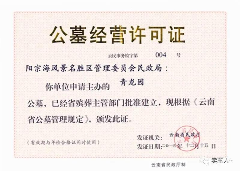 青龙园依法取得云南省民政厅颁发的《公墓经营许可证》、《经营性公墓年检合格证》和工商部门颁发的《营业执照》,是资质齐全的大型经营性公墓,青龙园运营规范,规划独到,还获得了《2013云南省城乡规划设计二等奖》和云南民政厅示范单位等荣誉。